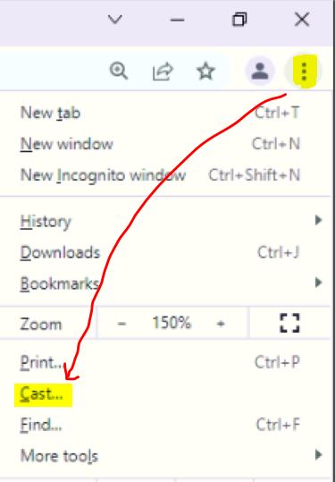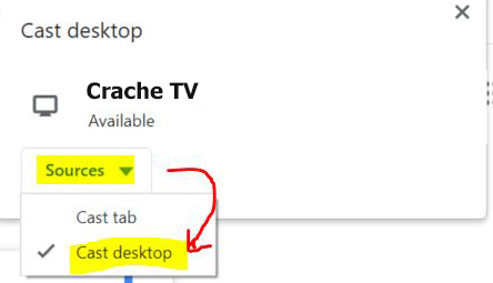 - Click the "Cast":option, select "Cast Desktop" from the "Source": Dropdown.