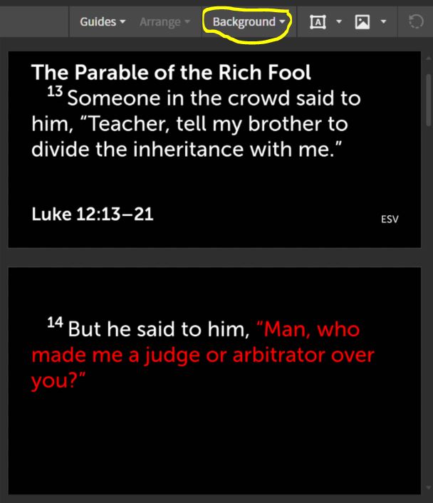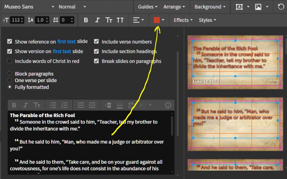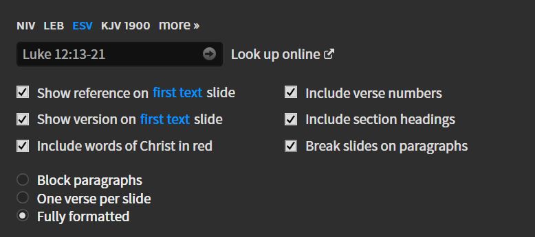If you wish to adjust the font size, colour or other settings Click in the lower centre pain containing the Bible verse text, and the options to adust fonts etc will be enabled.